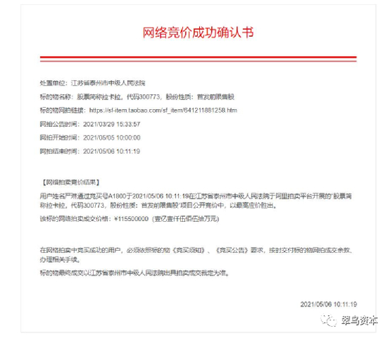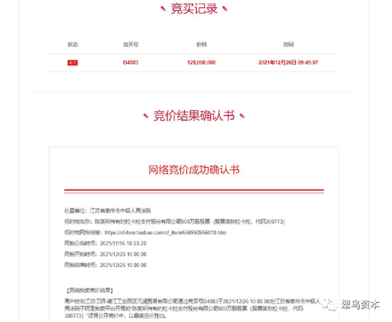 第二次是在收到深交所的处分没多久,陈江涛又有500万股拉卡拉股份被江苏省泰州市中级人民法院通过阿里拍卖平台执行了拍卖,缘由是其和靖江市润元农村小额贷款有限公司借款合同纠纷一案。此次拍卖全部由江苏江阴-靖江工业园区元润贸易有限公司竞得,金额为1.28亿元。