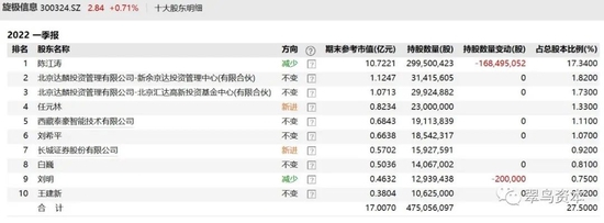其中,旋极信息于2012年登陆创业板,据其2022年一季报显示,陈江涛为公司第一大股东,目前直接持有公司股份2.995亿股,占公司总股本的17.34%,市值为8.5亿左右。