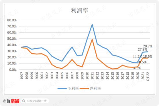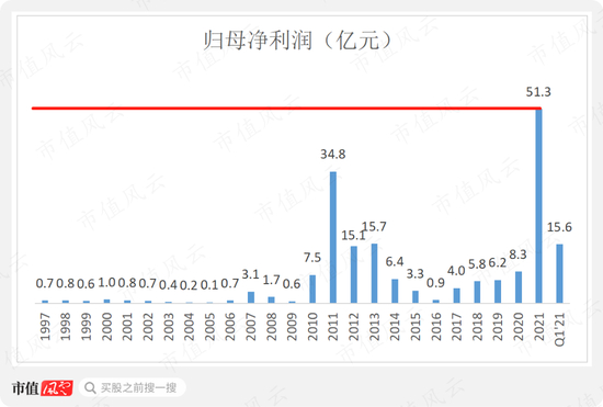 风云君如此担心,是因为自1997年上市以来,公司的历史最高利润也仅为2011年的34.8亿,其余年份大多在10亿以下,且波动较大。