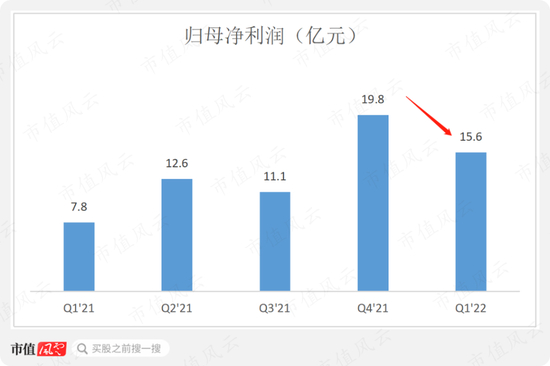 同时,公司归母净利润环比也有所下滑,由2021年四季度的19.8亿下降为2022年一季度的15.6亿。