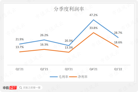 不过从季度数据来看,2022年一季度公司的毛利率和净利率环比2021年四季度有较大幅度的下滑,分别下滑18个和15个百分点。
