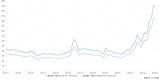 2022年以来继续大幅上涨,镨钕金属和氧化镨钕3月均价分别较2021年12月上涨了24%和22%。