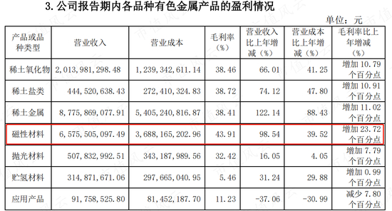 其中稀土功能材料中的磁性材料是毛利率上升的主力,上升了24个百分点。