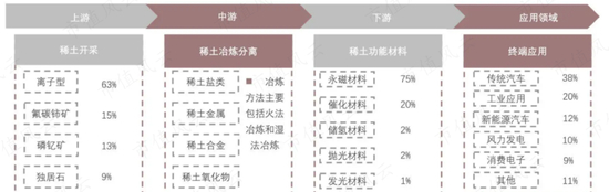 稀土产业主要分为上游稀土开采、中游冶炼分离、下游功能材料,以及终端应用领域。