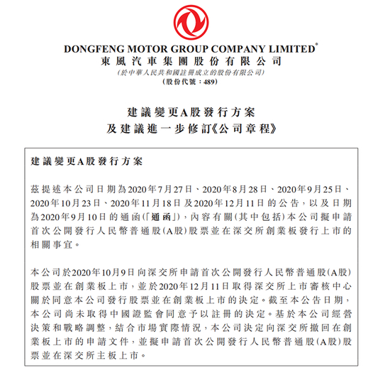 回查公告,东风集团在2020年9月启动了深交所创业板上市辅导。2021年9月,东风集团公告称,决定向深交所撤回在创业板上市的申请文件,并拟申请公开发行不超9.57亿股A股在深交所主板上市。截至目前,该事项未有新消息披露。