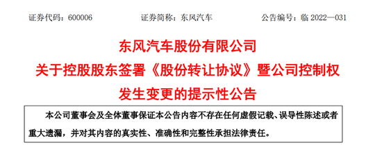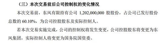 公告显示,本次交易前,东风有限持有公司12.02亿股股份,占公司已发行股份总数的60.10%,为公司控股股东及实际控制人。交易完成后,公司控股股东将由东风有限变更为东风集团;实控人将由东风有限变更为国务院国资委。