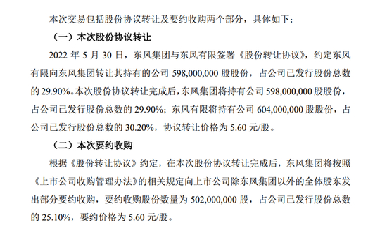 首先来看,根据《股份转让协议》,东风有限需向东风集团转让其持有的公司5.98亿股,占公司已发行股份总数的29.9%,协议转让价格为5.60元/股。