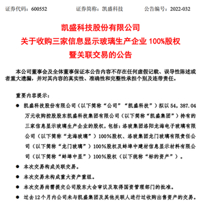 5月31日晚间,凯盛科技发布公告称,5月31日,公司与控股股东签署《股权转让协议》。根据协议,凯盛科技拟以约5.44亿元收购控股股东凯盛科技集团有限公司(下称“凯盛集团”)持有的三家信息显示玻璃生产企业的股权。