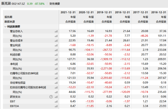 2019年-2020年,*ST新光分别实现营收16.93亿元、16.69亿元,归母净利润-50.95亿元、-32.65亿元,连续三年亏损。