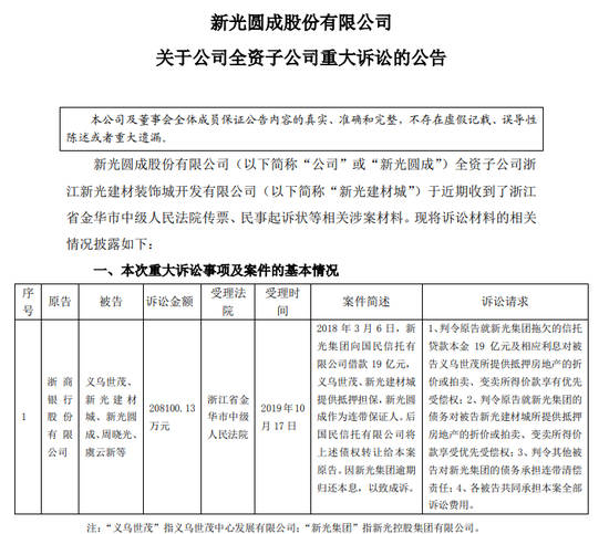 而因新光集团逾期归还本息,2019年,浙商银行将义乌世茂、新光建材城、新光圆成、周晓光、虞云新等告上法庭,诉讼金额20.81亿元。