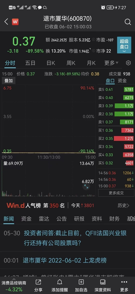 当日开盘,退市厦华直接大跌约88%,最终收于0.37元/股,下跌89.58%,市值缩水至仅剩1.94亿元。如此巨大的单日跌幅,不仅创下该股有史以来的纪录,A股历史上也颇为罕见。