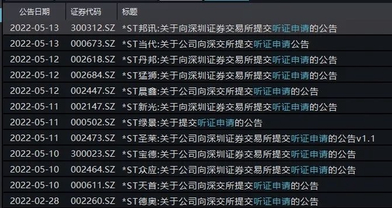 以“听证申请”为关键字进行搜索,截至5月23日,今年以来累计12家A股上市公司向交易所提交了听证申请的公告。