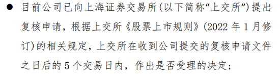 公司表示,其于5月31日向上交所提交了复核申请书,但尚未根据《上海证券交易所复核实施办法》的有关规定提交保荐机构和律师事务所就申请复核事项出具的意见书。根据上交所《股票上市规则》(2022年1月修订)相关规定,上交所将在收到公司提交的复核申请文件之日后的5个交易日内,作出是否受理的决定。