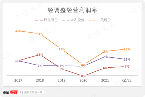 不过从2022年一季度来看,增速又倒过来了,三美股份最高,达40%,最低的永和股份为18%。