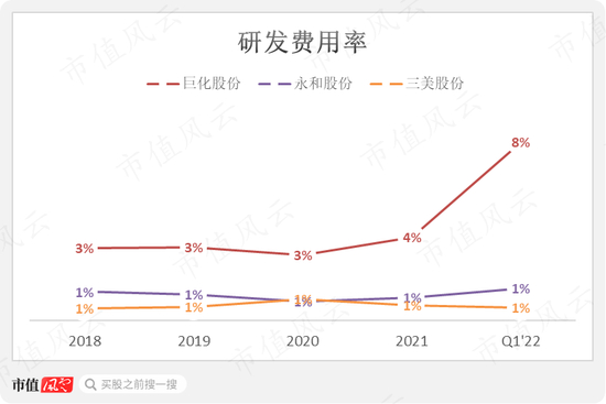 整体来说,三家公司产品当中高附加值、高技术含量的比例都较低。从研发费用率也能“管中窥豹”:除了巨化股份研发强度提升有些眉目,2022年一季度研发费用同比大幅增长221%,研发费用率达到8%以外,另外两家的研发费用率持续徘徊在1%。