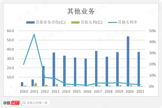 其他业务营收规模历来不低,从2013年开始就始终处于30亿以上,2020年甚至达到54亿,但是与规模不相适应的是利润率之微薄,自2014年以来常年毛利率都低于5%。