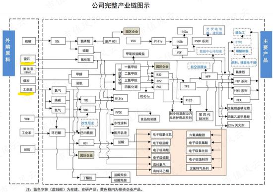 但目前PVDF显然还不是公司核心业务。根据2021年公司给出的完整产业链图,可以说乍一看颇有“我全都要”的气势,这当中主要是围绕氟化工和氯碱化工展开。