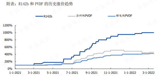 这当中,最有趣的是不管是涂料级PVDF还是锂电级PVDF,涨价幅度倒远远不及生产PVDF所用的上游核心原材料R142b,后者涨幅接近10倍。