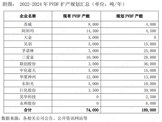 根据联创股份(300343.SZ)的统计,PVDF产能目前为7.4万吨/年,而2022-24年这三年间的新规划产能是18.9万吨/年。