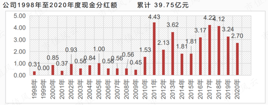 根据公司披露,1998-2021年间,公司累计实现归母净利润103.74亿,同期现金分红43.26亿(含2021年拟分红3.51亿),分红比42%,表现较好。