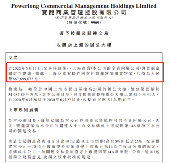 5月11日,宝龙商业发布公告称,计划收购一幢位于上海的办公大楼,代价8.68亿元。