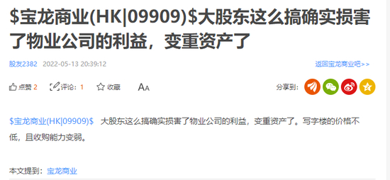 业界几乎一直认为,该笔交易致使宝龙商业重型资产比率大幅提升,与宝龙商业本身的发展基调和集团内的定位有所矛盾。