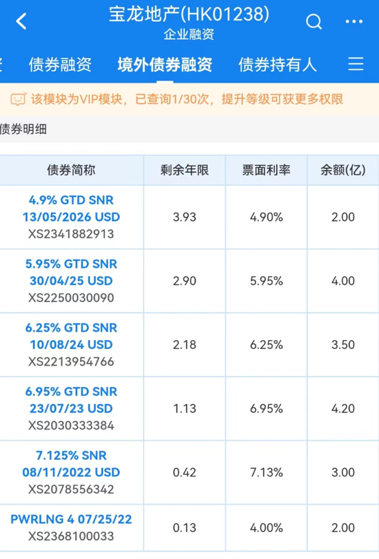 据企业预警通显示,截至目前,宝龙地产存续美元债6只,存续规模18.7亿美元,其中将有两只合计5亿美元债于年内到期。