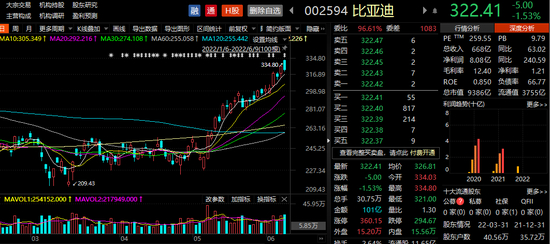 今日,比亚迪开盘涨2%,股价创历史新高,总市值逼近万亿。截至收盘,小幅下跌1.53%,总市值为9386亿元。