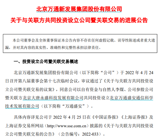 时隔一年多,万通发展与大唐永盛再度“牵手”。4月24日晚,万通发展公告称,其将与关联方共同投资设立公司万通盛安,注册资本为7000万元。