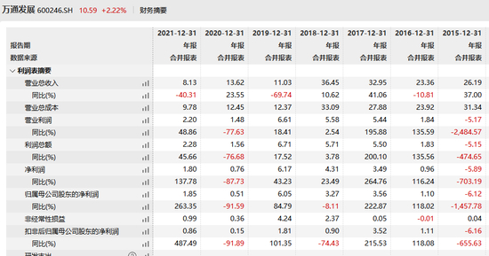 之后,万通发展虽然一直在寻求战略转型,但从结果来看,公司的营业收入却逐渐降至近15年来最低值,仅为8.13亿元,同比下降40.31%。