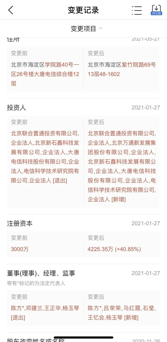 爱企查显示,2021年1月27日,大唐永盛投资人发生了变更,万通发展成为股东之一,持股29%。同时,万通发展董事长王忆会也在该公司新任董事一职。