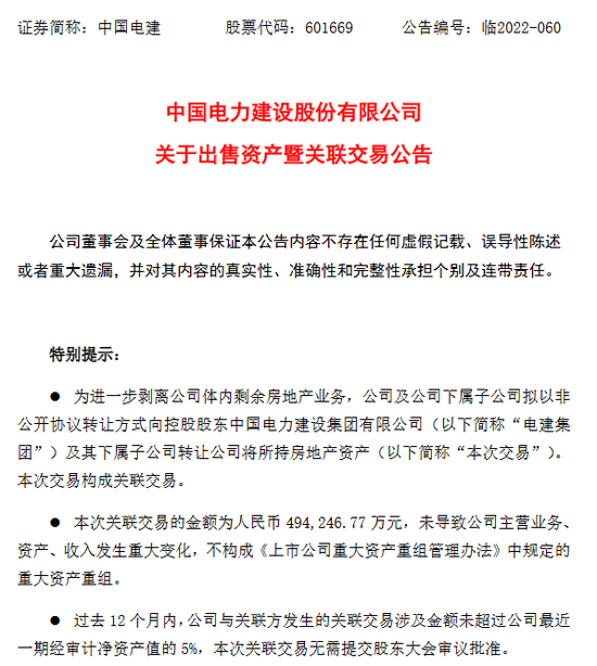 6月8日,中国电建公告表示,公司拟向控股股东电建集团及其下属子公司转让所持房地产资产。