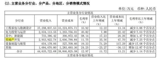 其中,中国电建2021年房地产开发实现营业收入295.39亿元,同比增长35.56%,占主营业务收入的6.62%;毛利率11.75%,同比下降7.25个百分点,毛利额占比6%。