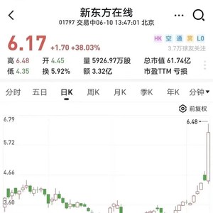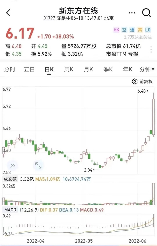 新东方在线的股价,也一路飙升。6月10日盘中一度涨近40%。