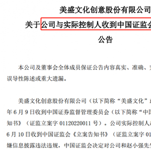 6月12日下午,ST美盛公告,于2022年6月9日收到中国证监会的《立案告知书》,而公司实际控制人赵小强则于2022年6月10日收到中国证监会《立案告知书》。因涉嫌信息披露违法违规,中国证监会决定对公司和赵小强立案。