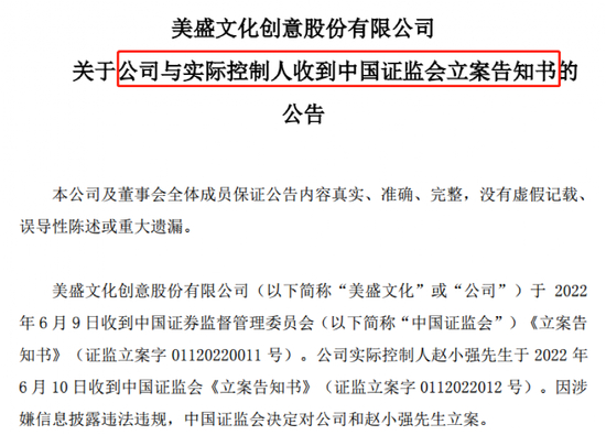 美盛控股系美盛文化的控股股东,赵小强系美盛文化的实际控制人。双双遭立案后美盛文化称,在立案期间,公司和实际控制人将积极配合中国证监会的调查工作,并就相关事项严格履行信息披露义务。