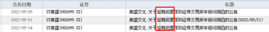 对大股东违规占资等事项,早在2022年5月5日深交所上市公司管理二部就对公司下发了《关于对美盛文化创意股份有限公司2021年年报的问询函》,但公司迟迟不回,已经延期三次,截至目前公司仍未完成回复工作。