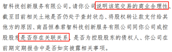 深交所要求公司说明该笔交易的商业合理性、截至目前相关土地是否仍处于查封状态、将股权转让款支付给其他方的原因、南昌恒泰君智科技创新服务有限公司同公司或控股股东是否存在关联关系、是否为控股股东的债权人、公司在前期定期报告中是否如实披露相关事项。