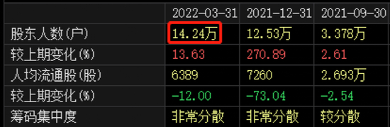 去年12月上旬,市场热炒元宇宙概念,美盛文化收出7天6板的战绩,也就在此时公司的股东户数从三季度末的3万多暴增到四季度末的12.53万,进入2021年其热度依然不减,截至一季度末股东户数继续攀升至14.24万。