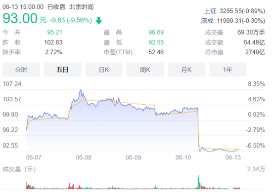具体来看,药明康德A、H股盘中均一度大跌超过9%,其A股一度触及跌停;公司早盘一直在跌停线徘徊,截至13日收盘,其A股股价为93元/股,大幅下跌9.56%,市值蒸发300亿元,H股报收94.10港元/股,跌幅达到10.72%。