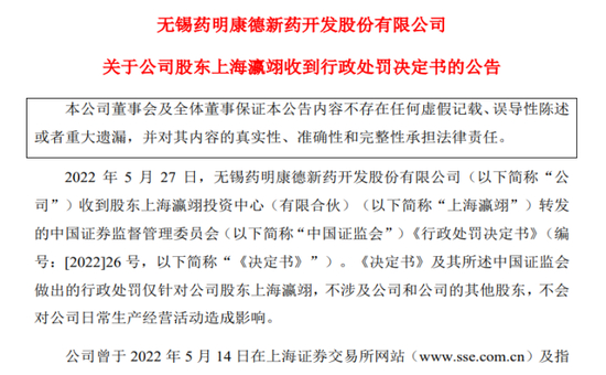 据公告内容显示,药明康德公司股东上海瀛翊投资中心(有限合伙)转发的中国证监会《行政处罚决定书》。决定书显示,上海瀛翊未按规定履行信息披露义务,转让股票不符合相关规定,证监会责令上海瀛翊改正,给予警告,并处以2亿元的罚款。