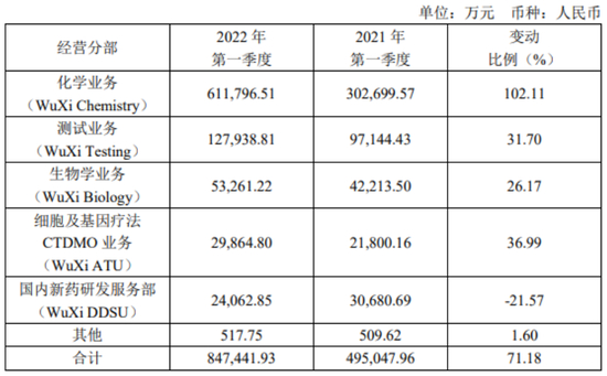 早在3月9日,药明康德就在《2022年1至2月主要经营数据公告》中披露,“公司预计2022年第一季度收入同比增长将达到65%-68%。展望全年,公司收入同比增长有望达到65%-70%”。