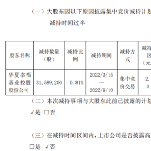 6月13日晚,华夏幸福披露控股股东被动减持进展,截至目前,金融机构累计处置华夏控股股份3158.92万股,占华夏幸福总股本的0.81%,套现总金额8668.12万元。