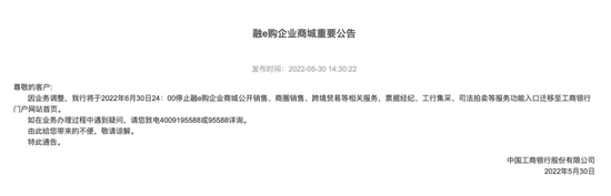 同时关停的还有融e购的企业商城业务。根据公告,将同时停止融e购企业商城公开销售、商圈销售、跨境贸易等相关服务,票据经纪、工行集采、司法拍卖等服务功能入口迁移至工商银行门户网站首页。