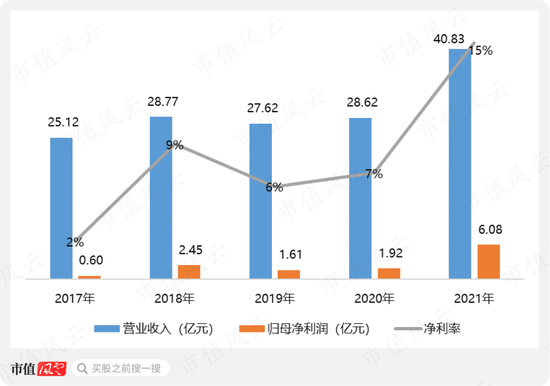 行业的波动也传导至北京矽成的业绩,2019及2020年持续两年低迷后,2021年营收40.83亿元,归母净利润6.08亿元,净利率首次突破两位数。