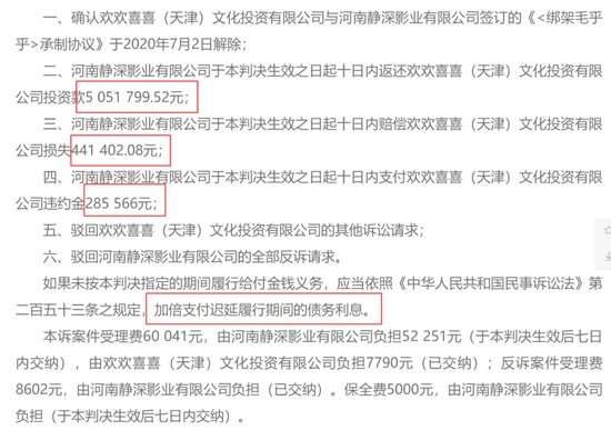 北京朝阳区法院一审判决《〈绑架毛乎乎〉承制协议》于2020年7月2日解除,静深影业返还投资款505.18万元,赔偿损失、支付违约金共计72.7万元。