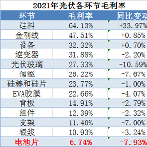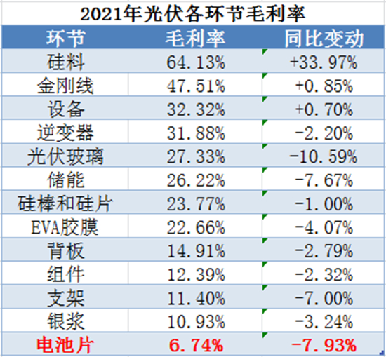 统计显示,2021年,在光伏产业链10多个主要环节中,电池片平均毛利率为6.74%,相比2020年大降7.93个百分点,盈利能力和毛利率降幅均排在产业链最末,与排在第一的硅料毛利率水平相差近10倍。