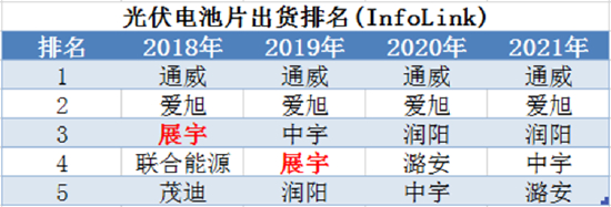 根据光伏产业权威分析机构PV InfoLink公布的排名显示,2018年,展宇新能源位列光伏电池片出货量第三,2019年降至第四,而2020年和2021年均被挤出前五,市场份额被竞争对手抢占。而上市公司通威股份和爱旭股份则一直稳居前二的位置。