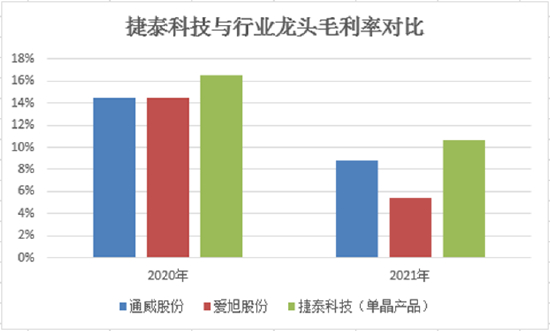 统计显示,就当下最为主流的单晶电池片产品而言,2020年和2021年,捷泰科技毛利率均高于行业出货量排名第一的通威股份和排名第二的爱旭股份。