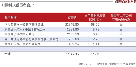 2019年,灿勤成为华为的核心供应商,2021年向华为的销售额约为2.28亿元,占营业收入的比例为 68.50%,超过 50%。